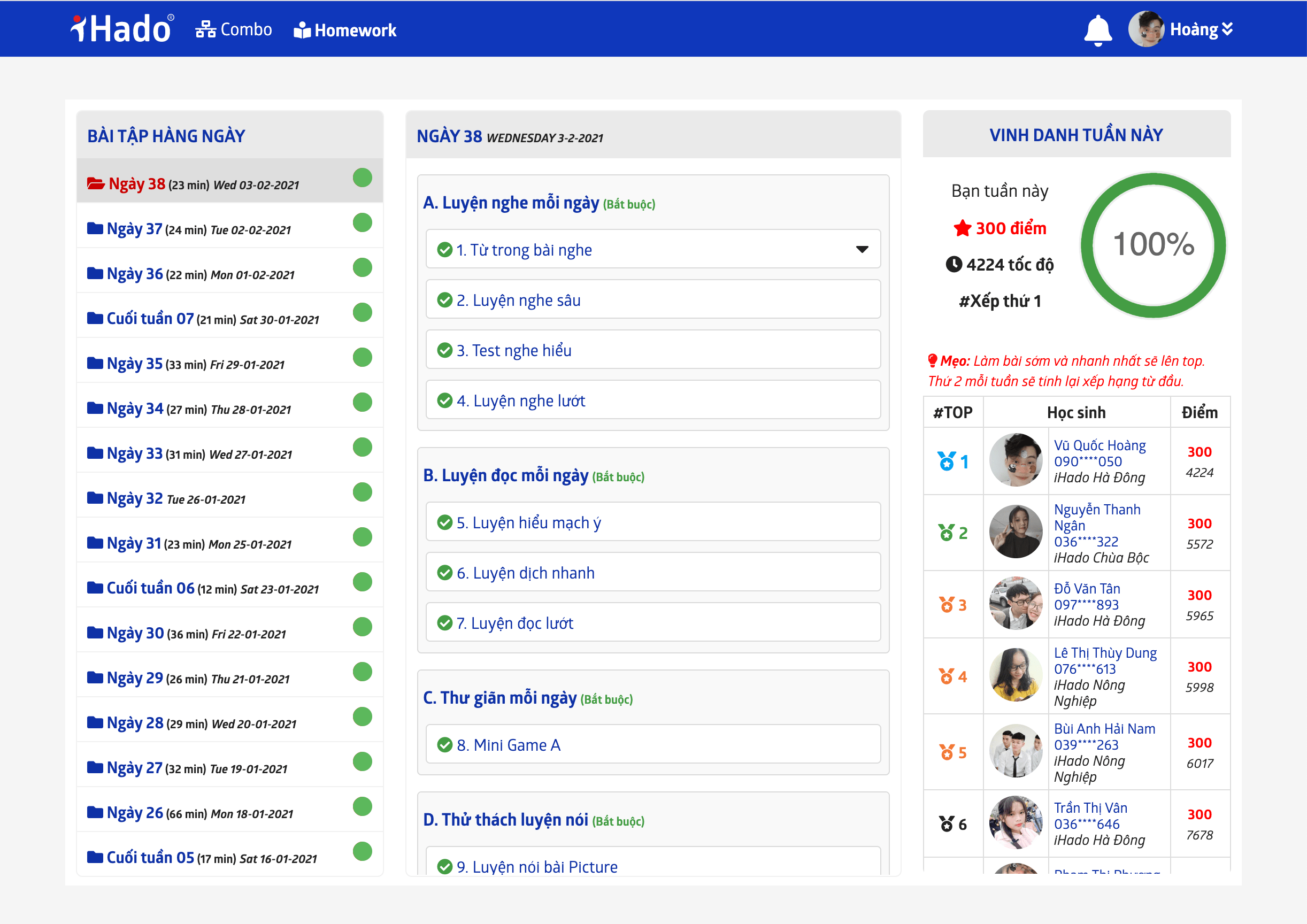 Bảng vinh danh học viên iHado tuần 01/02/2021 - 07/02/2021