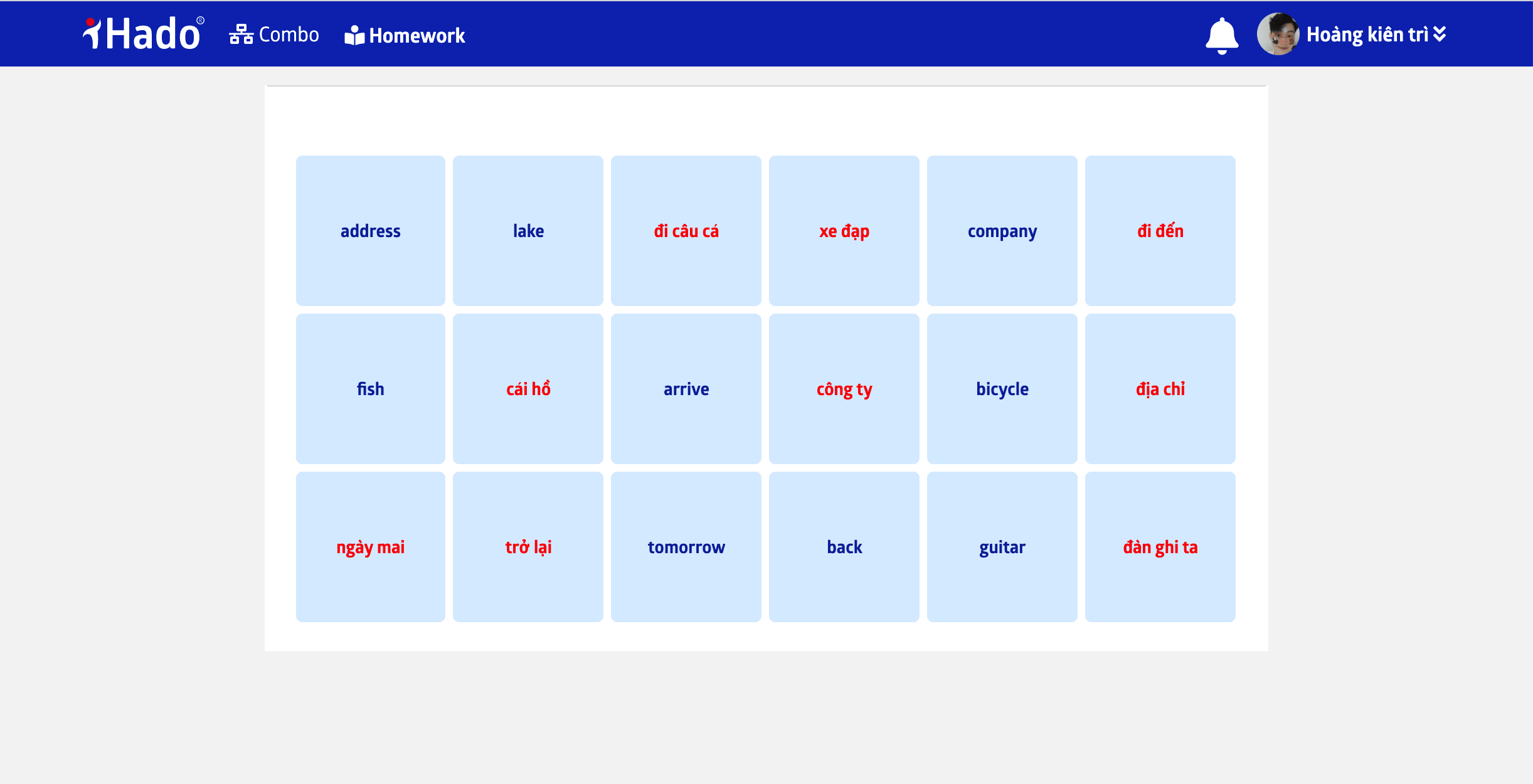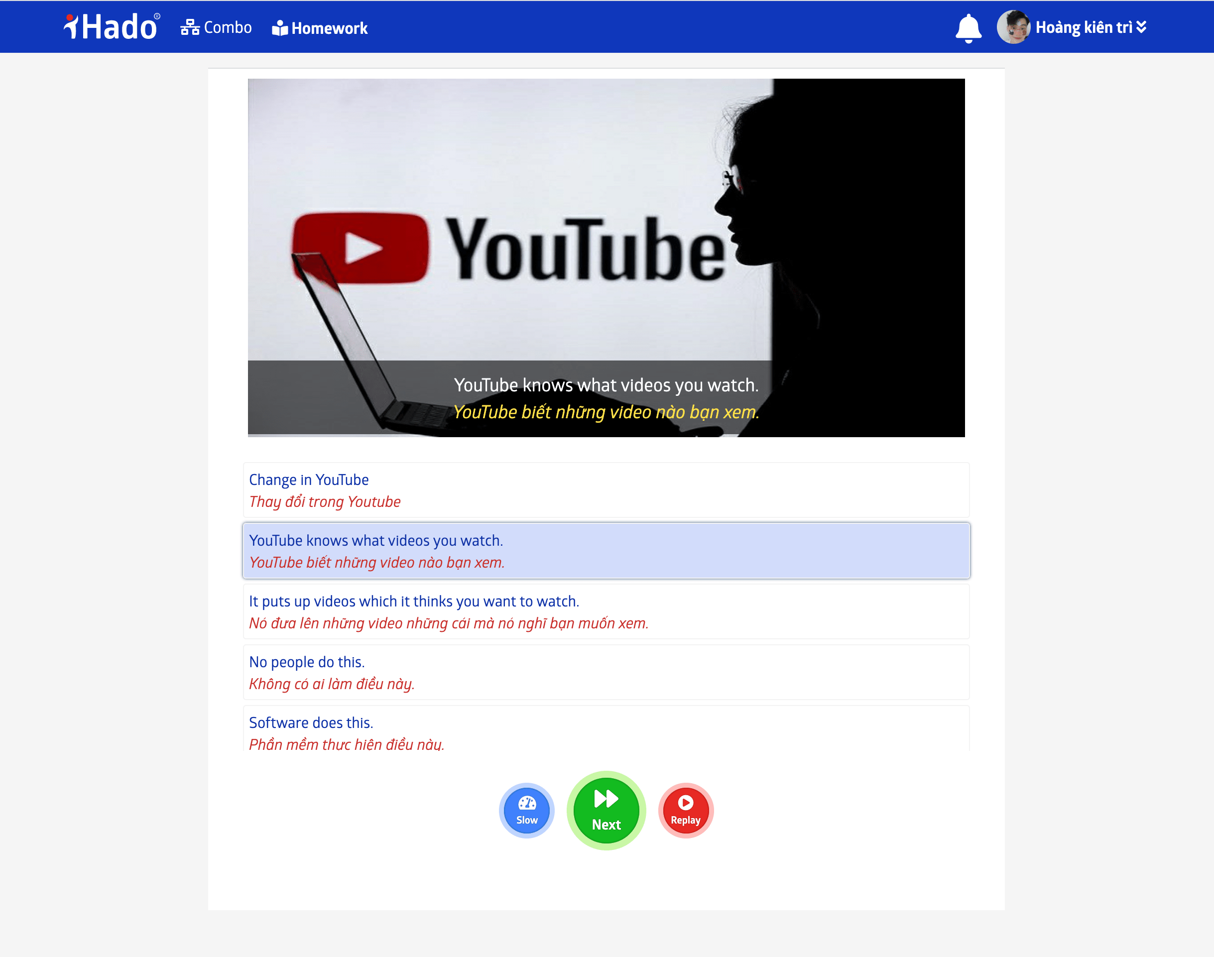 Học trên hệ thống iHado: Chủ yếu tập chung vào thực hành, bởi học Tiếng Anh cần quá trình rèn luyện liên tục và lặp đi lặp lại rất nhiều lần. Hệ thống iHado đã giải quyết 100% vấn đề khó khăn của người học, với các bài học được số hóa dựa trên nguyên lý trò chơi và tâm lý học ám thị.